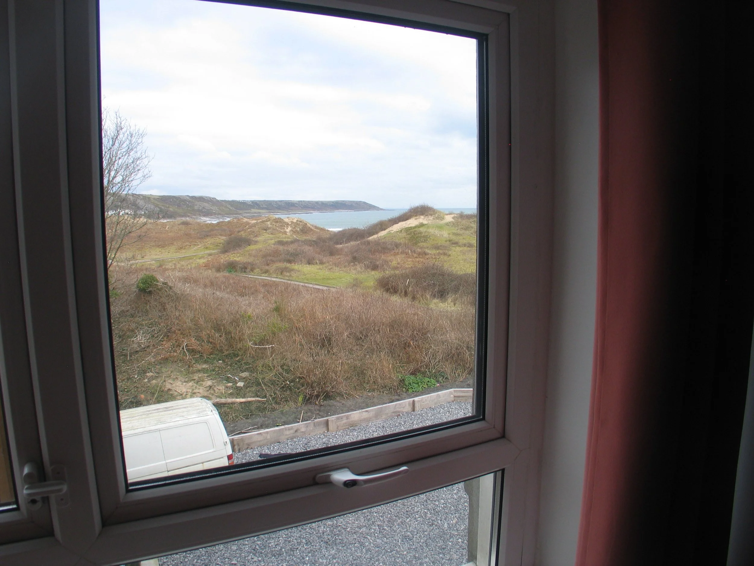 The open-plan living area features expansive bay windows and a private balcony showcasing stunning sea views.